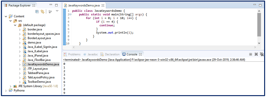 10. Continue: The ‘continue’ keyword is used to skip the current execution and continues to the next step in a loop like a For loop or a While loop.