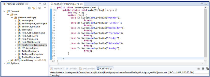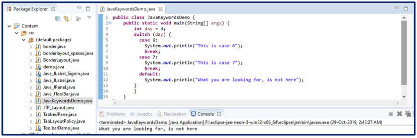 6. Case: Case keyword is used in a switch statement. The ‘case’ keyword creates a block of code and marks it.