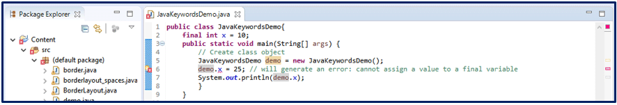 17. Final: The ‘Final’ keyword is used to set a final value to a variable, making it impossible to overwrite or change altogether. If the value of a final variable is tried to change, it throws an error.