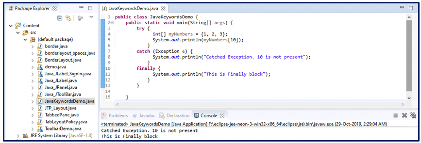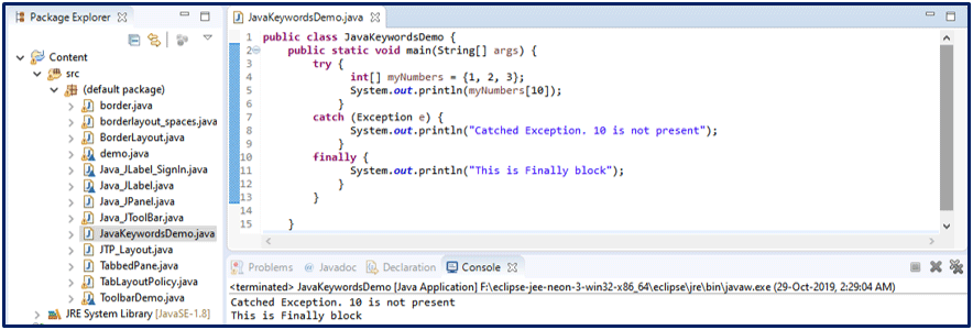 7. Catch: The ‘catch’ keyword catches the exceptions that were created by the ‘try’ statements. The catch block is used after Try block.