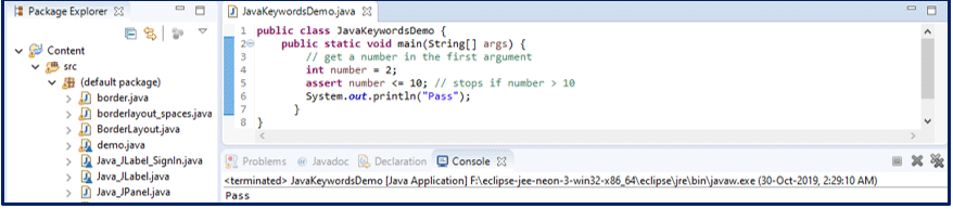 2. Assert: The ‘assert’ keyword was added to Java 1.4. This keyword allows a programmer to test his assumptions in the program.