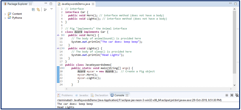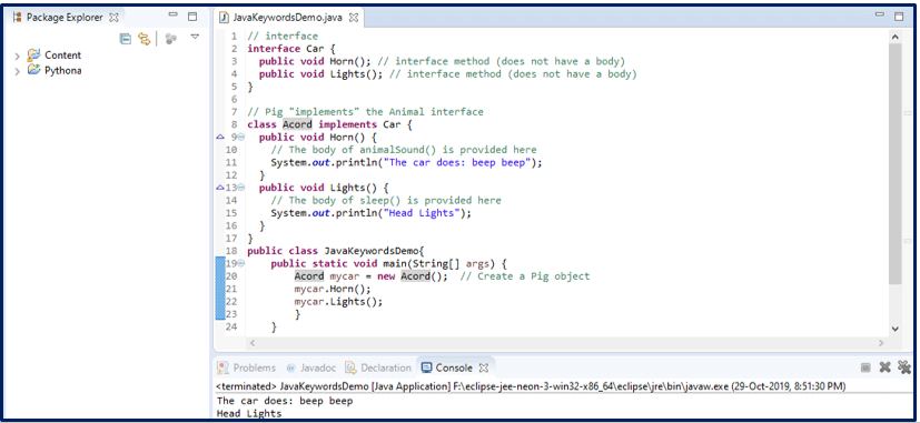 26. Interface: The interface keyword is used to declare a special type of class that will only contain abstract methods. For accessing the interface methods, the interface must be “implemented” like we use the inheritance concept by another class by using the ‘implements’ keyword.
