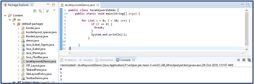 4. Break: This keyword helps the programmer want his code to jump out of a loop, for example, a For loop. It’s a control statement that breaks the current flow of the execution on a specific condition provided by the programmer.