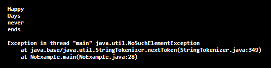 In this program, a StringTokenizer is created first, and tokens are selected five times. As there are only four tokens, NoSuchElementException is thrown. In order to avoid this, a check can be given before iterating the Tokenizeras shown below.
