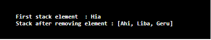 A stack to accept integer elements is created first. Once it is created, elements are added to the stack using the push() method. After printing the current elements in the stack, two elements are removed from it. For checking whether those elements are from the stack, elements are printed one more time. On executing the code, it can be seen that two elements are removed from the stack.