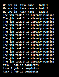 The above code covers each step of the creation of the thread till it’s shutdown. There is a maximum thread limit fixed and created. Once this is done, there are three jobs created which execute one by one. There is also a sleep time allotted for 2 secs for each job. As the thread pool is created and all jobs work simultaneously, we can see that this entire process will run 6 times. When the if statement runs in the thread pool, it checks if the job is already running or not. If the job has not started running, it will execute the if block. If it is already running, then the else block will be run. It will display the job name and say that it is already running. The thread pool is created, and then all 3 jobs are run. Once the jobs are run, we shut down the thread pool that we have created.