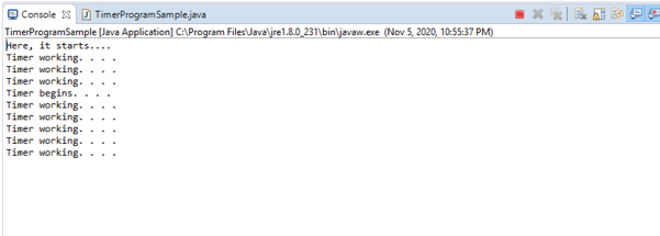 In this program also, all the necessary classes have to be imported. Then, create an object for the timer and schedule it. Override the run method and print a message notifying you about the timer. Like the first one, the run method must schedule and override it.