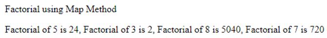 Here, we saw map method called myFunction for each member of the array numbers and print the result of it that is factorial of each number in new array resArray.