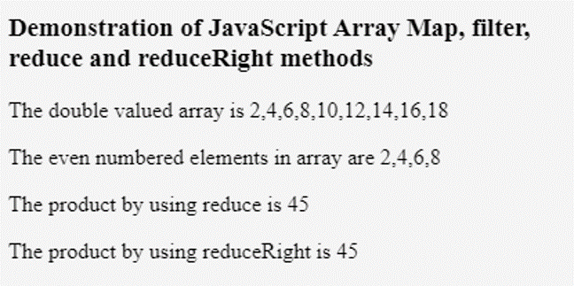 <h3>Demonstration of JavaScript Array Map, filter, reduce and reduceRight methods</h3>
