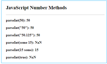 document.getElementById("result4").innerHTML = "parseInt(some 15): " + parseInt("some 15");
