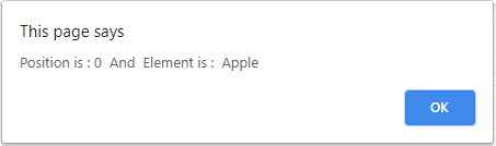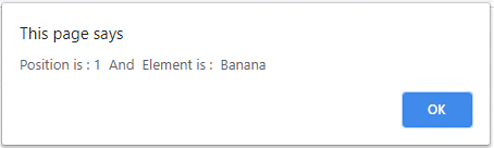 As in the above program an array is created which contain five elements and later the each() function is called on that array with function and its parameter index and element, the each() function start iterating over all that array elements, and one by one all elements are printing as an output by the alert() method, as we can see in the output.