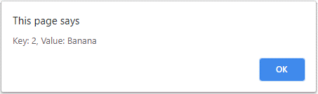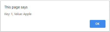 As in the above program, an object is created which contain five elements, and later the each() function is called on that object with function and its parameter key and value as $.each({ 1:’Apple’, 2:’Banana’, 3:’Orange’, 4:’Mango’, 5:’Cherry’ }, function( k, v )”, the each() function start iterating over all the elements and one by one all key-value pairs are printing as an output by the alert() method, as we can see in the output.
