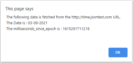 alert( " The following data is fetched from the http://time.jsontest.com URL." + "\n The Date is : " + data.date + "\n The milliseconds_since_epoch is : " + data.milliseconds_since_epoch + "\n " );