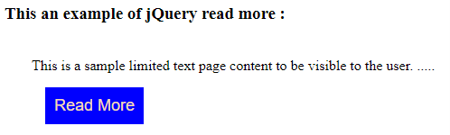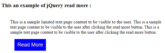 The jQuery read more is used to limit the page text visibility. When we need to hide the content of the page of a particular size, in place of showing all the text content, we can use the read more button or link. The read more allows the user to read the full page content by pressing the read more button or link. Whereas pressing the read less button can use to hide the content of the page.