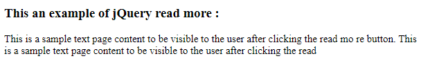 In the above code, first the div element content display, then span element content is hidden by using the class “more” and then the read more button is displaying. On click of the read more button it displays the previous content (span element) by toggle the display value property as “$( this ).prev().toggle();”, so it displays the hided span content, as we can see in the above output.