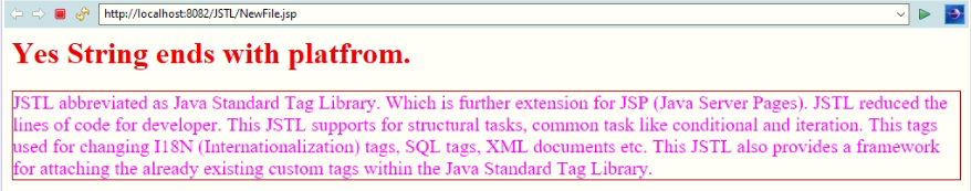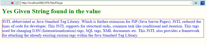 <p style="color:blue;border: 1px solid red;font-size:20px">JSTL abbreviated as Java Standard Tag Library. Which is