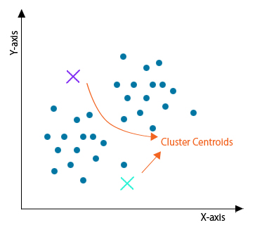 Firstly, initialize any random points called the centroids of the cluster. While initializing, you must take care that the centroids of the cluster must be less than the number of training data points. This algorithm is an iterative algorithm; hence the next two steps are performed iteratively.