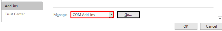 Step 3: Select COM Add-ins under the Manage section dropdown and click the Go button.