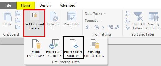 Step 6: It should open a new tab named Power Pivot for Excel. There are different ways to import data under PowerPivot. Click the Database tab to add data from SQL Server, Access. However, if you have an Excel file or text file, or some data files other than SQL and Access, please click on From Other Sources tab.