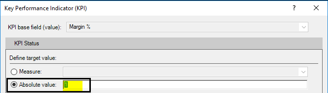 Step 17: In this window, define an Absolute Value for the target as 1. We are doing this because we don’t have any other target values/measures defined separately to compare with actual values of Margin %.