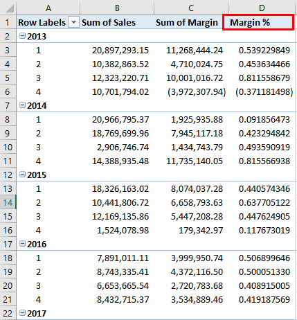 Here, we have created a new calculated column named Margin%, formulated as the ratio of two columns, Sum of Margin and Sum of Sales. Once you are done with this step, click on the OK button, and you will see a new calculated column named Margin% under the pivot table.