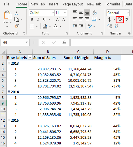 Step 15: Select the entire column, Margin %, and convert it to % using number formatting.