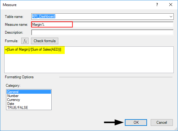 Step 14: Under” Measure name:“, add a name for your measure (For e.g., Margin%). If you want to add a description for the same, you can also add it under the Description section. Under the Formula section, add the formula =[Sum of Margin]/[Sum of Sales] as shown below. It will calculate the Margin% for you. See the screenshot below.