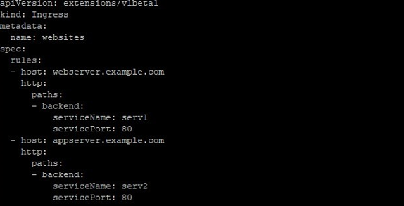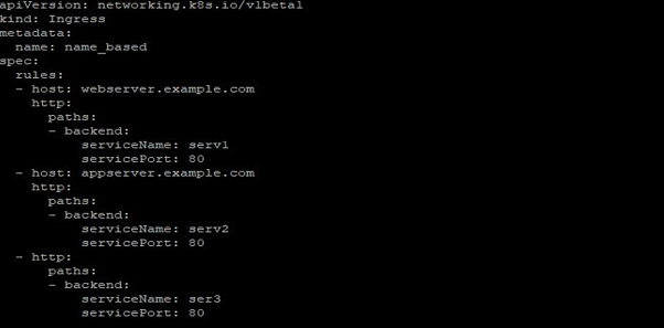 If in your resources file you don’t define the host field for a service, then any web traffic requesting to your Ingress controller will be forwarded without any name-based virtual host tagged to it. For example, in the following, Web traffic for webserver.example.com will be forwarded to serv1, appserver.example.com to serv2, and any web traffic to the IP address with no host field defined, will be sent to ser3.