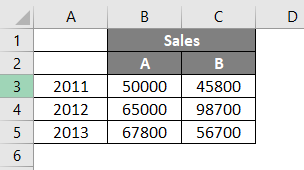 Now we will create a small chart and perform different actions on legends. Consider a small table that represents the sales of A and B for the years 2011, 2012, and 2013.