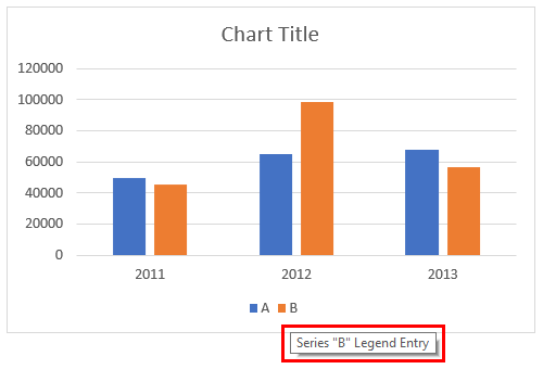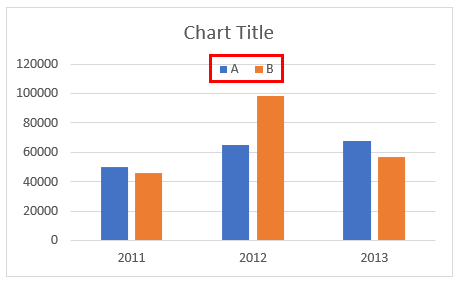The Legend will be created automatically when we create a chart in Excel. If we observe, A and B represent two different colors, and the bars also represent the same color for 2011,2012, and 2013.