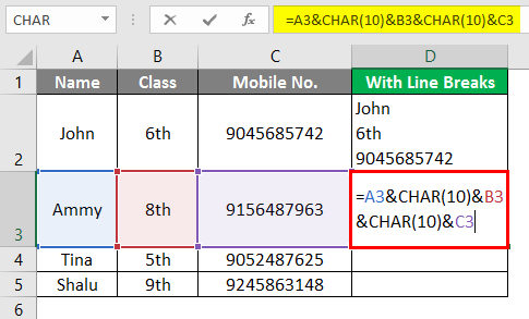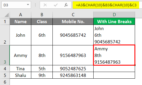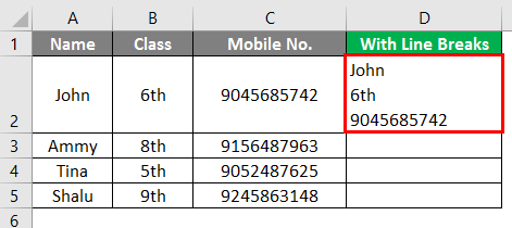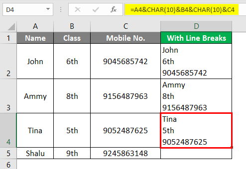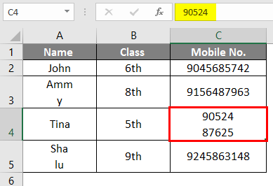 Here, we have inserted the line break after five digits of Mobile no. in cell C4. But this method is time-consuming and inefficient when we have to do the same in many cells. In that case, we use a formula to add a line break.