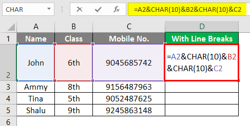 To add a line break, we use the concatenation operator with the CHAR function in the above-written formula. CHAR function returns the result based on the ASCII code, which is a character code. Here, we have some examples to explain the working of this formula.