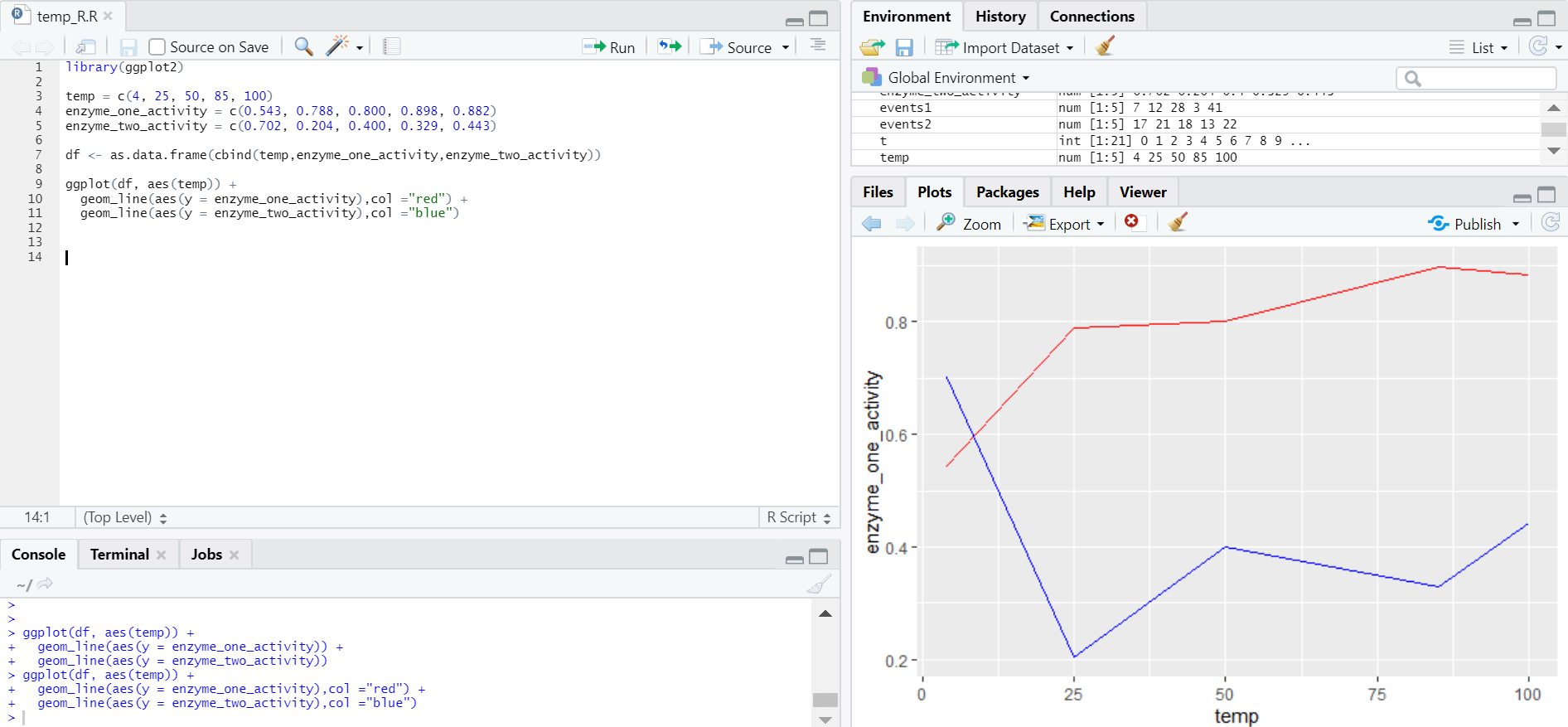 df <- as.data.frame(cbind(temp,enzyme_one_activity,enzyme_two_activity))