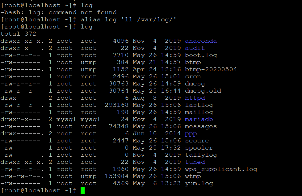 - First, we need to create an alias in the machine. As per the screenshot 2 (a), we have created the “log” alias and assign the command to it “ll /var/log/”. Before creating the alias, if we will enter the “log” then it will display “command not fount”. After creating an alias, the “log” alias is working fine.