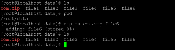 As per the above command, we are having multiple files at the “/root/data” location. We are zipping the multiple files into the com.zip file.