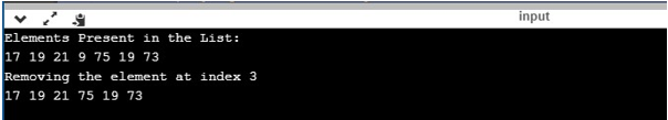 // 9 will be removed from the List // and 75 will come at index 3 firstlist.RemoveAt(3);
