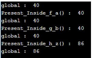 Here the global variable is defined outside the scope followed by three functions where the local variable is declared with the global variable all together and having the nested presence within it as shown in the output. Always the priority is given to the inside and local variable within nested function followed by outside.