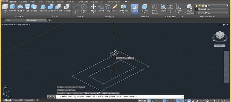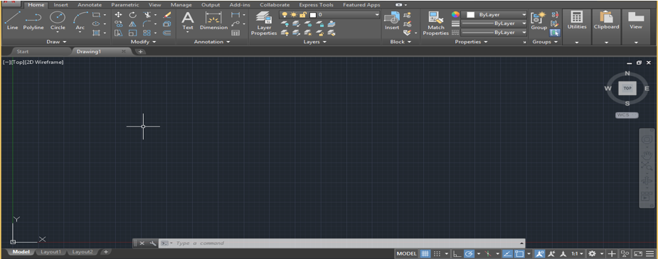 Step 1: At the top of the working screen there is a ribbon of different tabs which have a different type of commands for making our work easy such as Home, Insert, Annotate and many others, below this, we have working window area in which you can see your current drawing or work, this working window also has a navigation cube through which you can see your drawing from different view option such as Top view, Front view, and side view, below this window we have some navigation tools for handling different type of tool during our work.