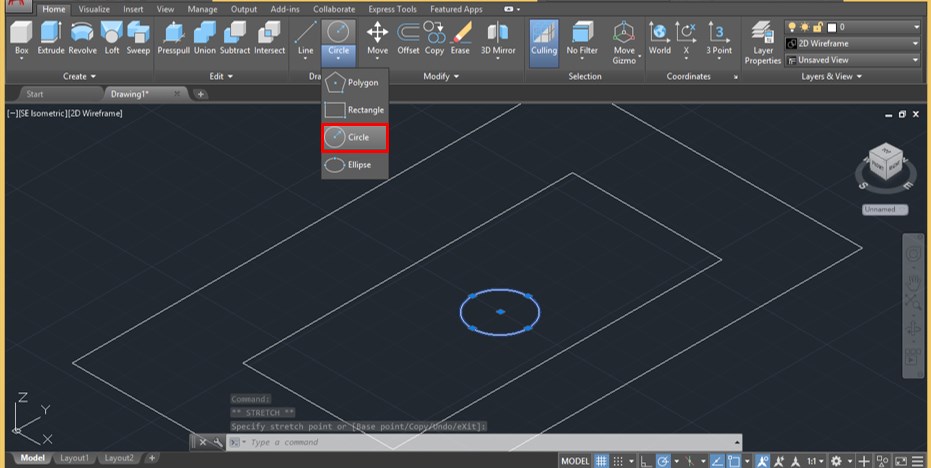 Step 6: Now, let us have a circle command. For the circle, the command goes to the Draw menu of the Home tab and click on the icon of circle command with the mouse button, then draw a circle of any radius at the center of these two rectangles like this.