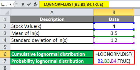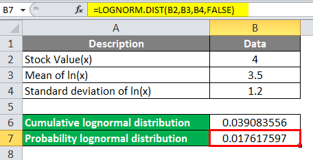 - Select the respective value from the user’s table, Stock Value(x)=4, Mean of In(x)=3.5, Standard deviation In(x)=1.2, and Cumulative value will be TRUE. Now we will calculate the function for the cumulative lognormal distribution function.