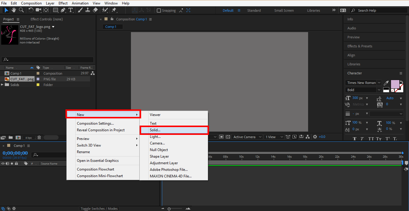 Step 3: Now, I will make a solid layer by right-clicking on the mouse in this section. A drop-down dialog box will be open, go to a new click on the solid tab or press Ctrl + Y on the keyboard.