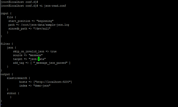 In this step, we are configuring the logstash configuration file. We are creating json-read.conf file in /etc/logstash/conf.d directory.