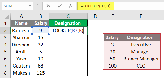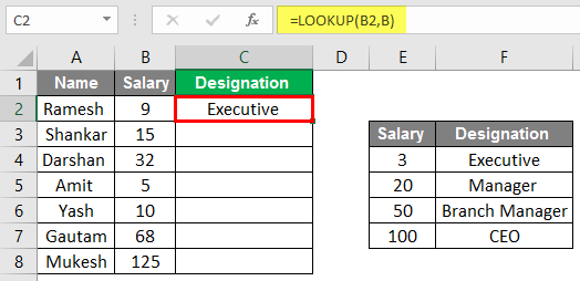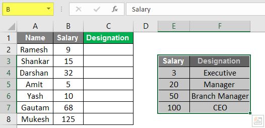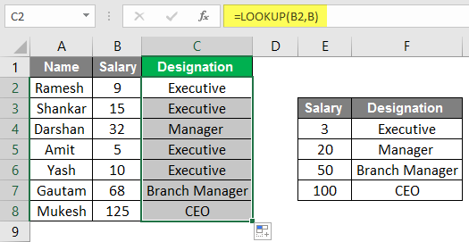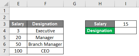 - For example, we have taken the value 15 as salary, so the formula will look up into the table and provide us with the designation according to the table, which is Executive.