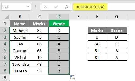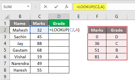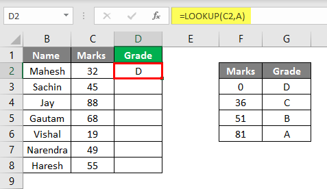 - Here also, we need a lookup vector, the value which defines marks in grades. We can see the image; on the right side of the image, we have decided the criteria for every grade; we will have to make it in ascending order because, as you all know, Look up every time assumes that the data is in ascending order. As you can see, we have entered our formula in D2 Column, =lookup(C2, F2: G6). Here C2 is the lookup value, and F2: G6 is the lookup table/lookup vector.