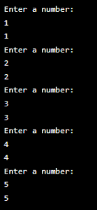 In the above example, “x” has a starting value of 1. The code block is executed considering the condition “x<= 5” is satisfied. The value of “x” is output by the print command, which is 1. Then, we use the “+=” operator to increase “x” by 1. Reevaluating the condition, “x” is now determined to be 2, so the loop is continued. The cycle continues until “x” equals 6; the loop ends when the given condition becomes false.