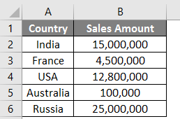 Let’s take a simple example of a map chart just to get an overview of how this works in Excel. Suppose we have data as shown below, which contains our sales values for different countries.
