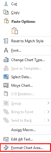Step 7: Now, Right-Click on the chart area to see a list of operations available for this chart. Out of all those operations, select the Format Chart Area option, which is situated at the bottom-most part of the operations list. Click on the Format Chart Area option. It allows you to format the chart area.
