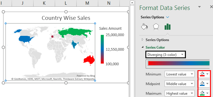 Step 12: Click the dropdown and select the Diverging (3-Color) option under Series Color. It allows you to differentiate your series into three patterns: Minimum, Midpoint, and Maximum (based on the series’s values and colors).