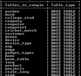 In this example, we already connected to the sample database; here, we use the full option with the show tables command. So it returns all the detailed structures of the specified table. The final output of the above query we illustrate by using the following snapshot.