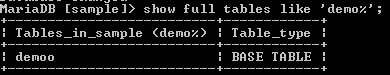 In the above example, we used the show tables command with full option, and like clause Here, the clause is used to show tables, views, and sequence whose name starts with a demo word. As shown in the above example. The final output of the above query we illustrate by using the following snapshot.